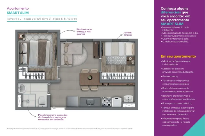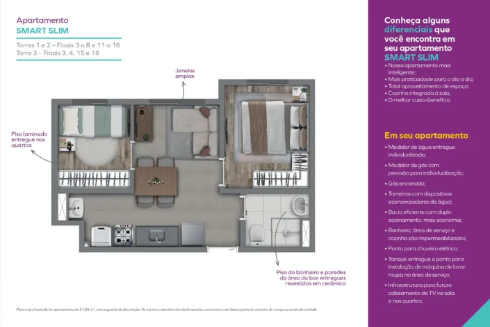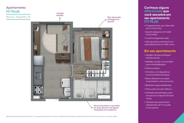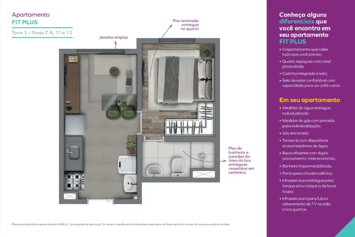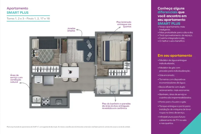 - Opções com cozinha integrada, ventilação natural, infraestrutura para TV, gás e internet